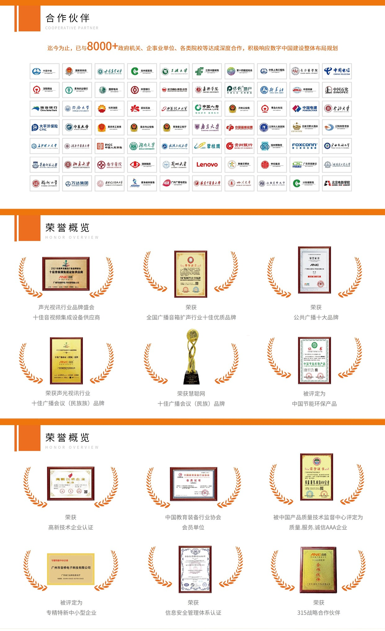 目前,集團以廣州營銷總部沉浸式場景體驗展廳為中樞,通過全國6大區域分公司及省級辦事處落地化服務布局,構建起覆蓋技術攻關、場景驗證到生態輸出的全鏈路服務體系。公司旗下ANE品牌連續多年斬獲"十佳音視頻系統解決方案品牌"、"十佳廣播會議民族品牌”、"十佳專業擴聲民族品牌”、"中國演藝設備技術協會金獎”等30余項行業殊榮,公司參與制定多項音視頻行業技術標準。