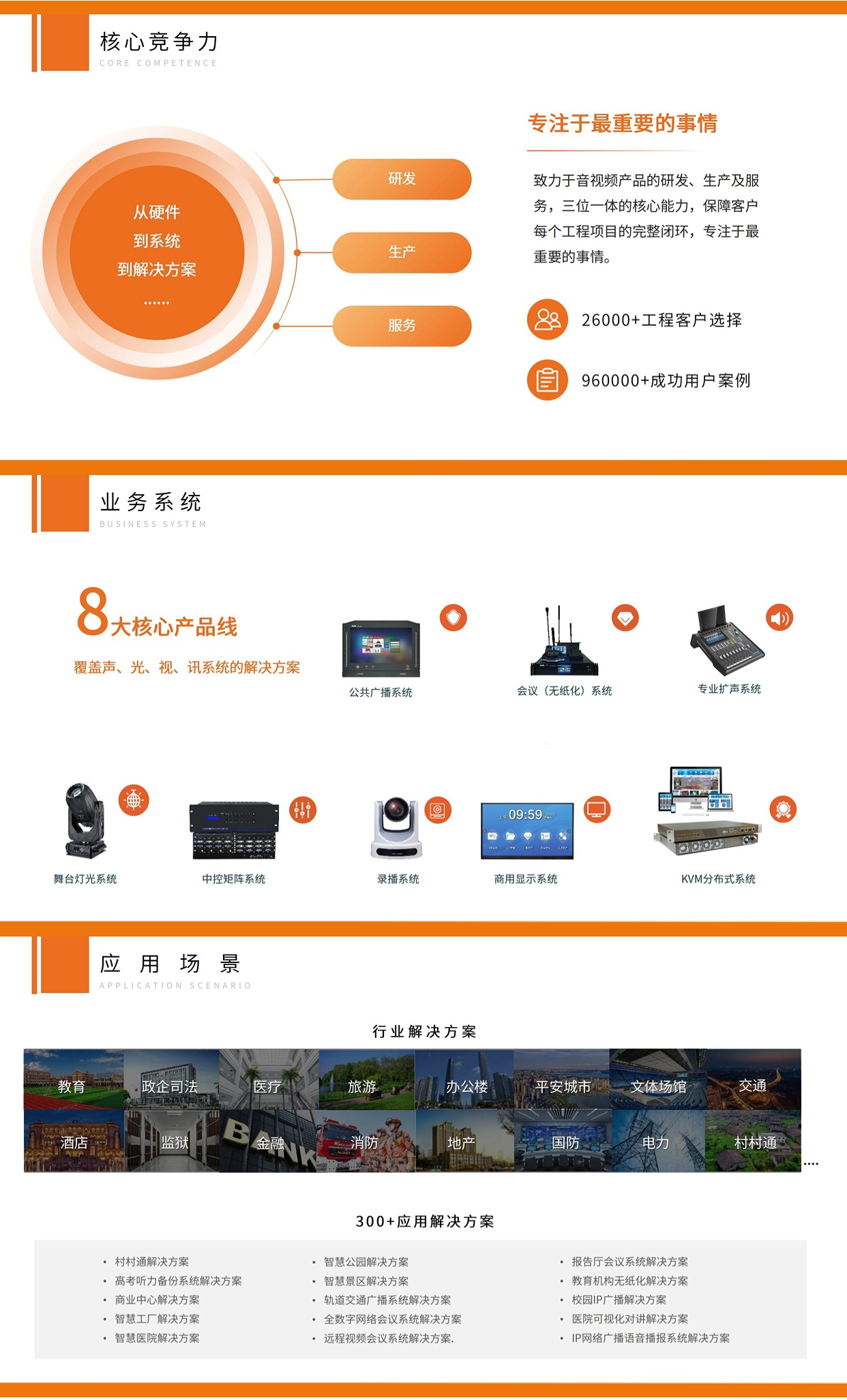 作為國家級高新技術企業,在智造實力方面,集團投資建設了總面積超15,000平方米的現代化產業生產制造基地,整合電聲制造中心、精密鈑金加工中心與物流中心于一體,配備全自動SMT貼片生產線及聲學實驗室,年產能突破行業標桿水平。技術研發層面,累計獲得1100余項核心技術專利,自主研發的智慧云廣播系統、全數字會議系統、AI聲場算法、5G超低延遲編解碼等創新成果,已成功應用于教育、公檢法司、軌道交通、文體場館、能源制造等十余個重點領域。